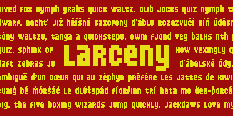 Today’s font release, Larceny, is also a demake! It’s even a game-related one, at that. I created this based on the font used in Grand Theft Auto: Pricedown by Ray Larabie @ Typodermic Fonts (which is based on a 1960s/1970s font called Pinto Flare, designer unknown).